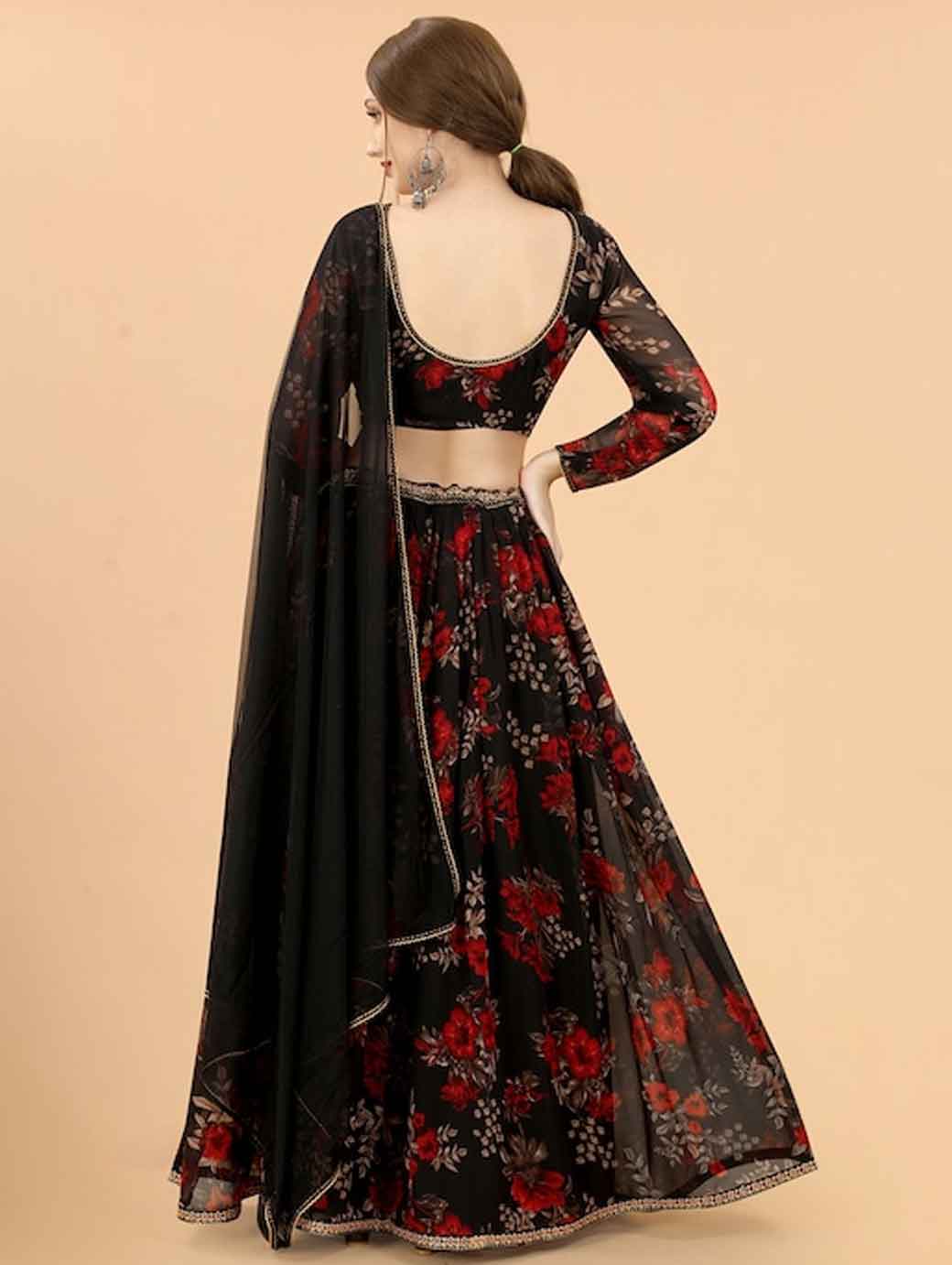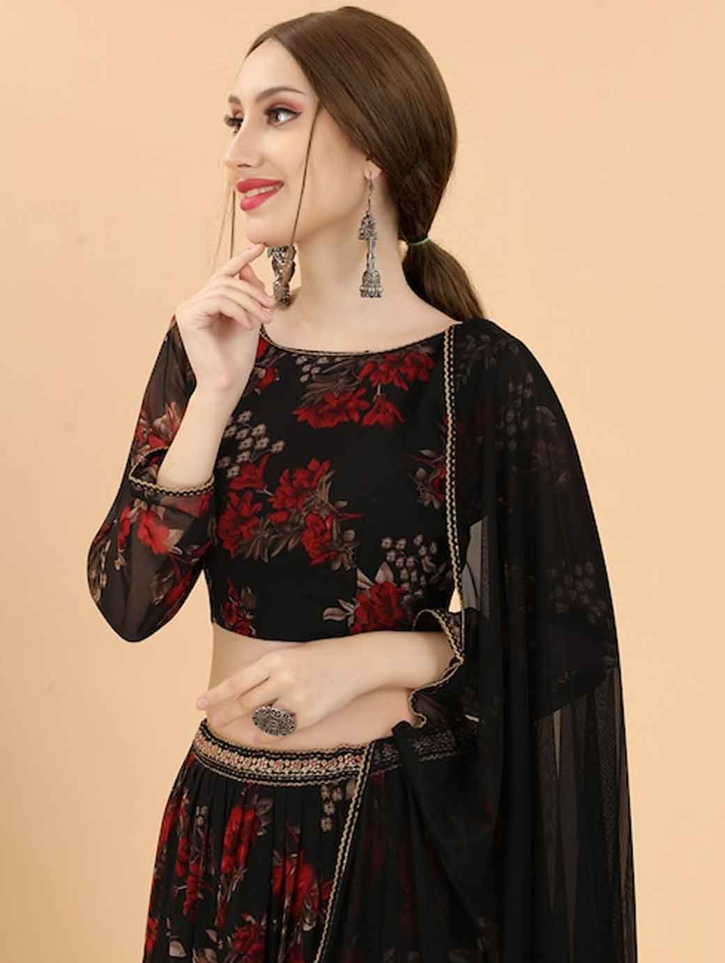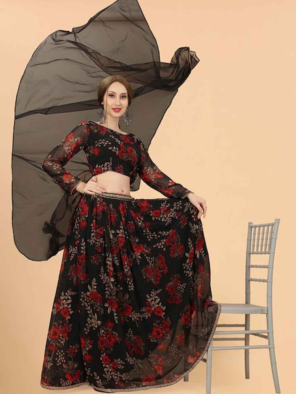 Take your traditional look to the next level with this elegant lehenga choli. It includes an enchanting boat neck and flared bottom to complete your look.