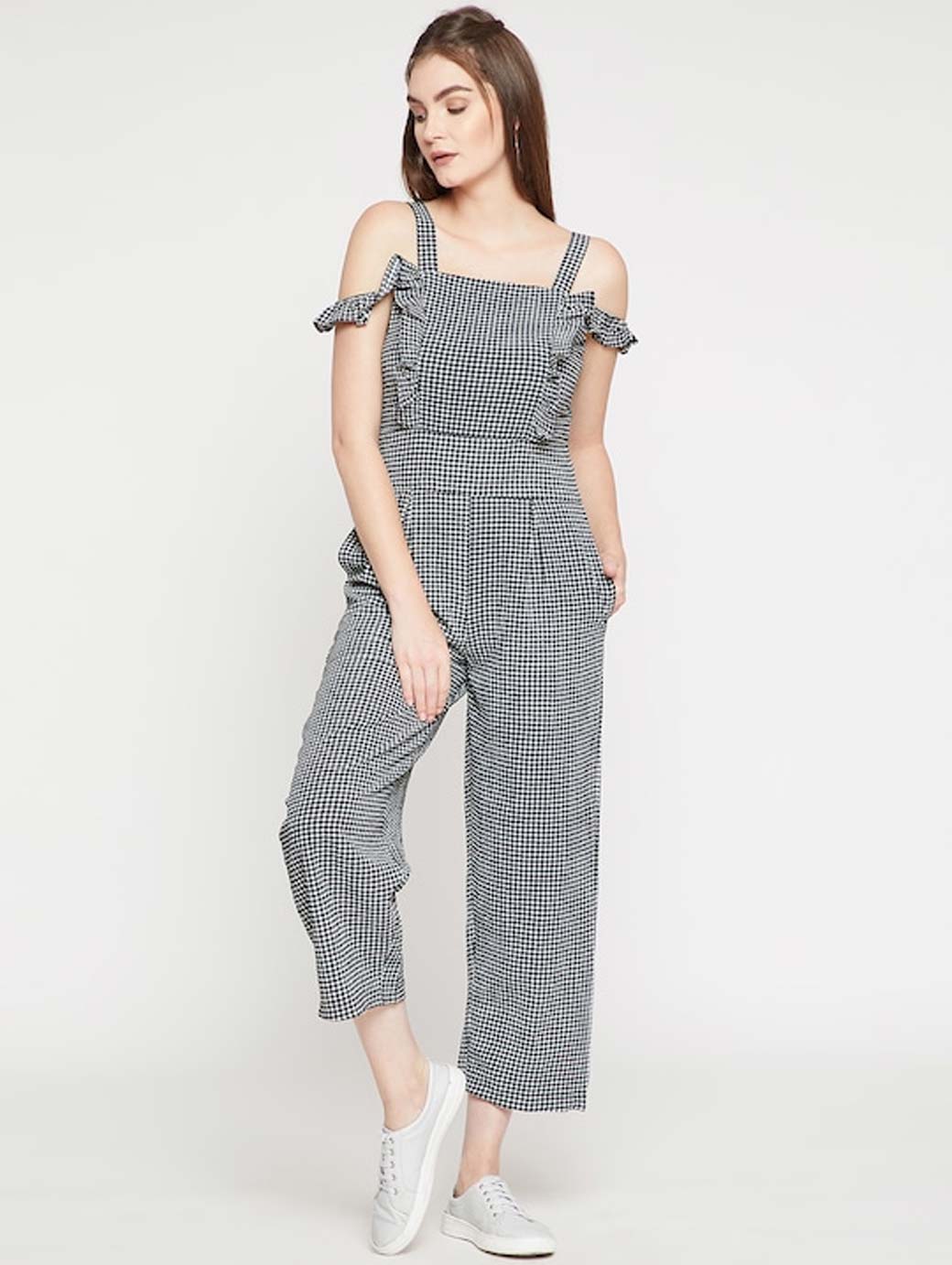 Black and white checked culotte jumpsuit with Ruffles, has a square neck, short sleeves, two pockets