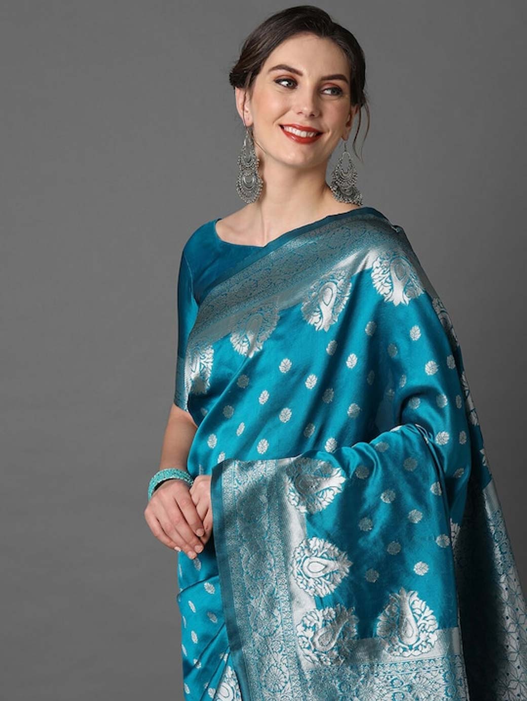 Blue & Silver-Coloured Ethnic Motifs Woven Design Silk Blend Banarasi Saree