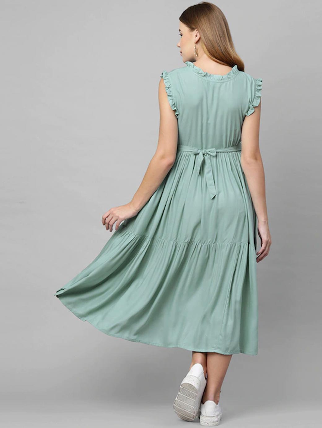 Green solid a-line dress High neck Sleeveless, no sleeves Ruffled detail Midi length in flared hem Comes with a belt