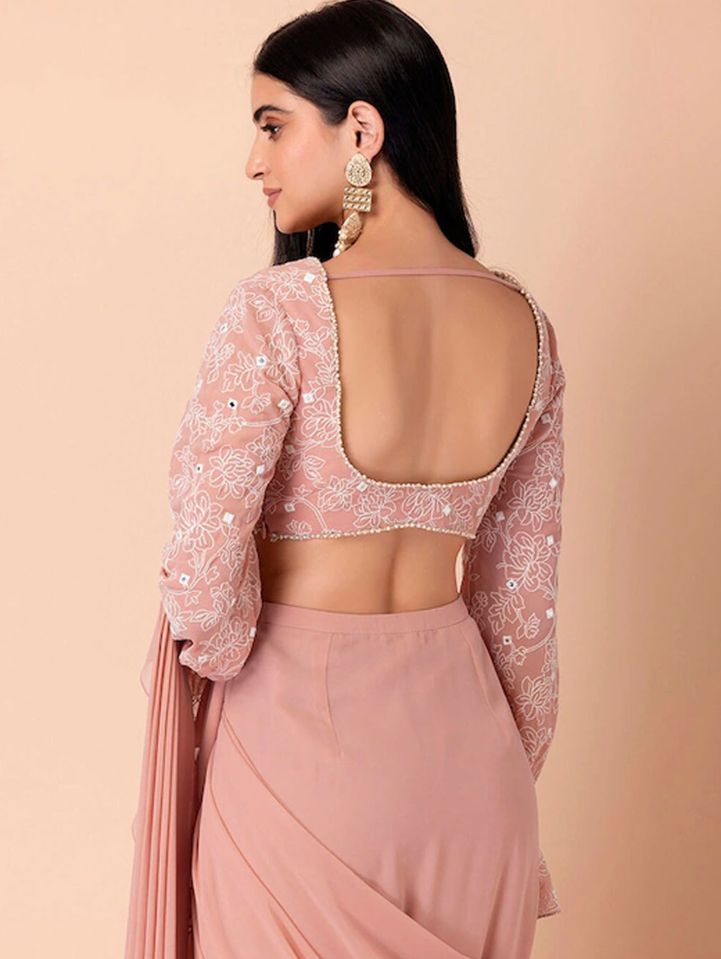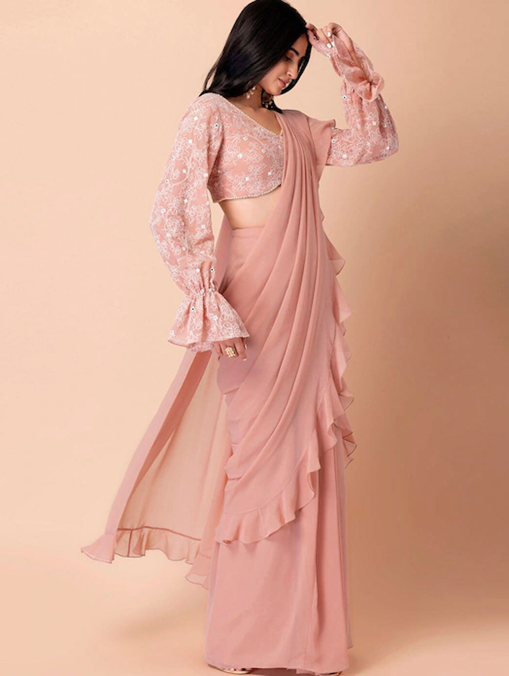 Pink crop regular top Floral embroidered V-neck, long, bell sleeve sleeves Woven georgette Concealed zip closure.