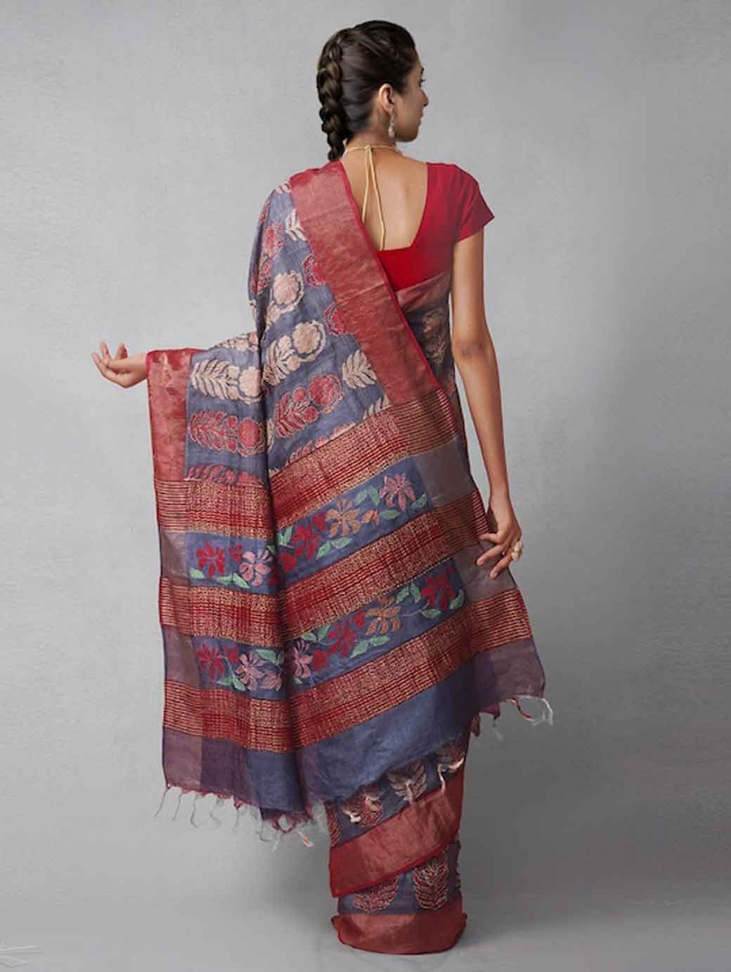 Maroon and blue tussar saree