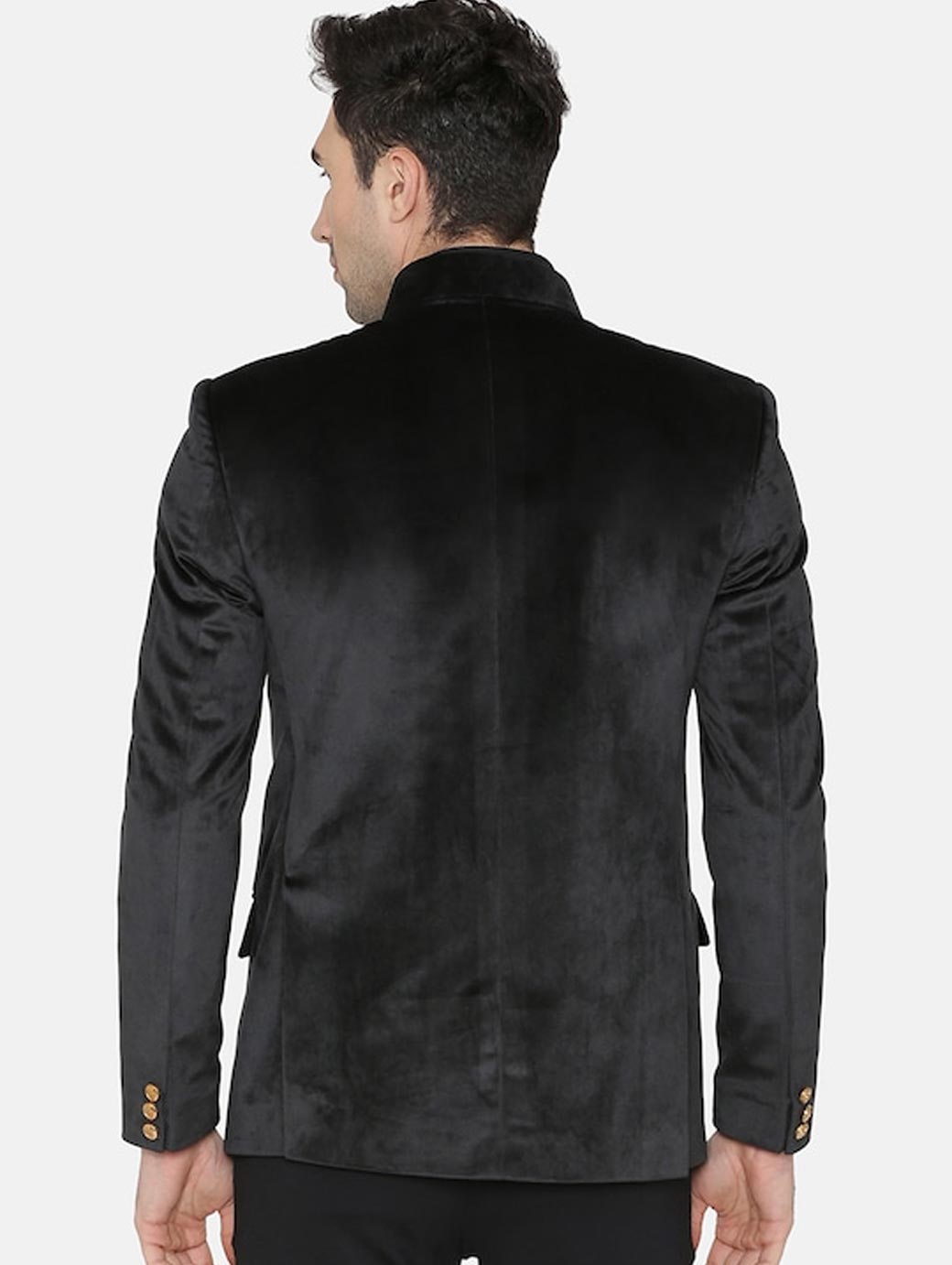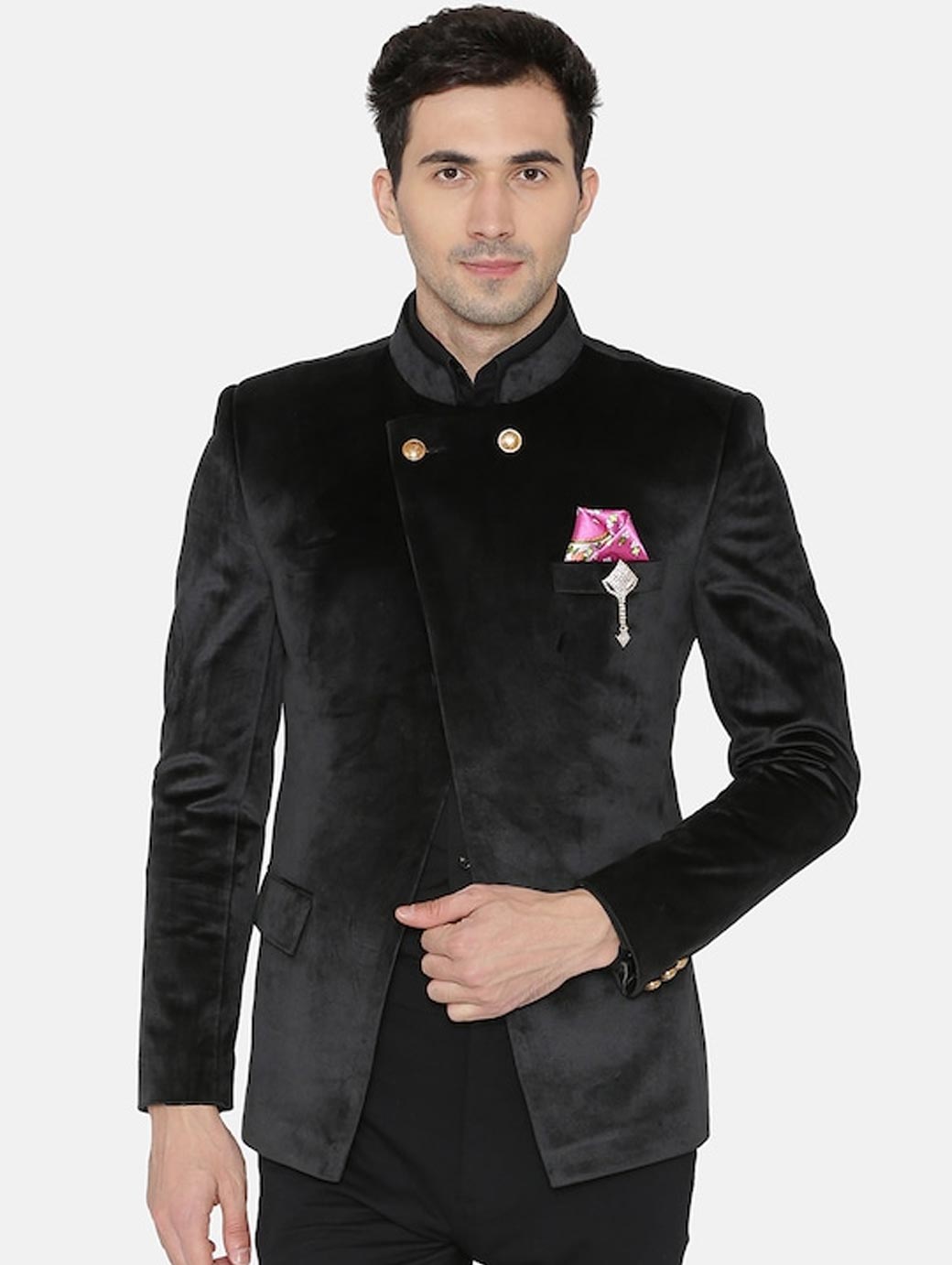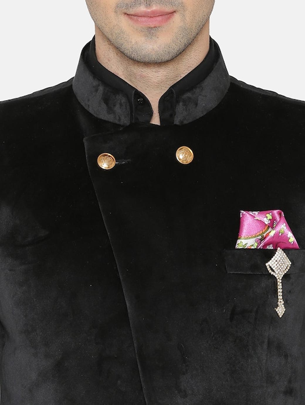Black solid regular-fit formal bandhgala blazer, has a mandarin collar, double-breasted with button closures, long sleeves, two flap pockets, one welt pocket, an attached lining and a double-vented back hem. Comes with a pocket square and a brooch