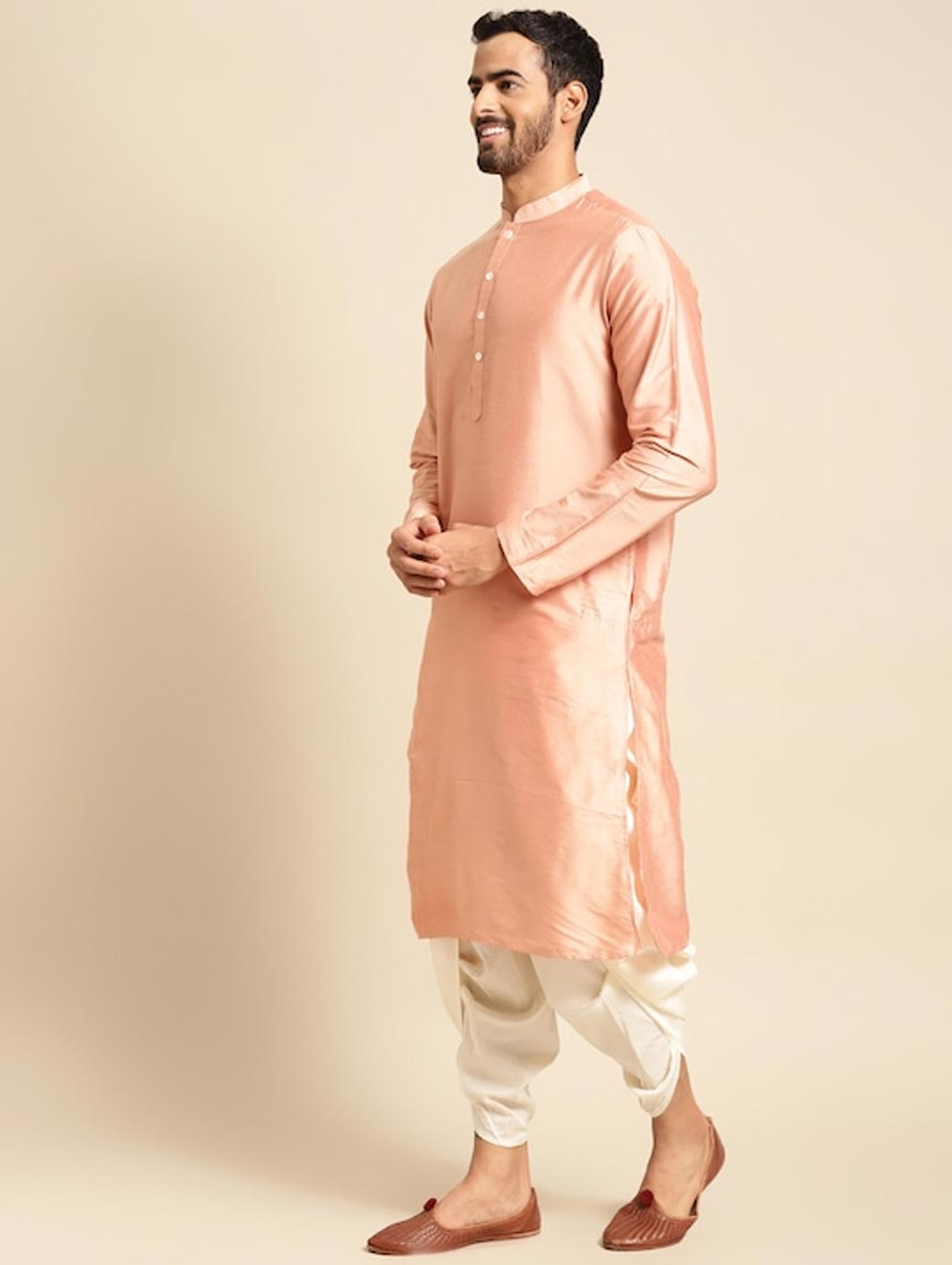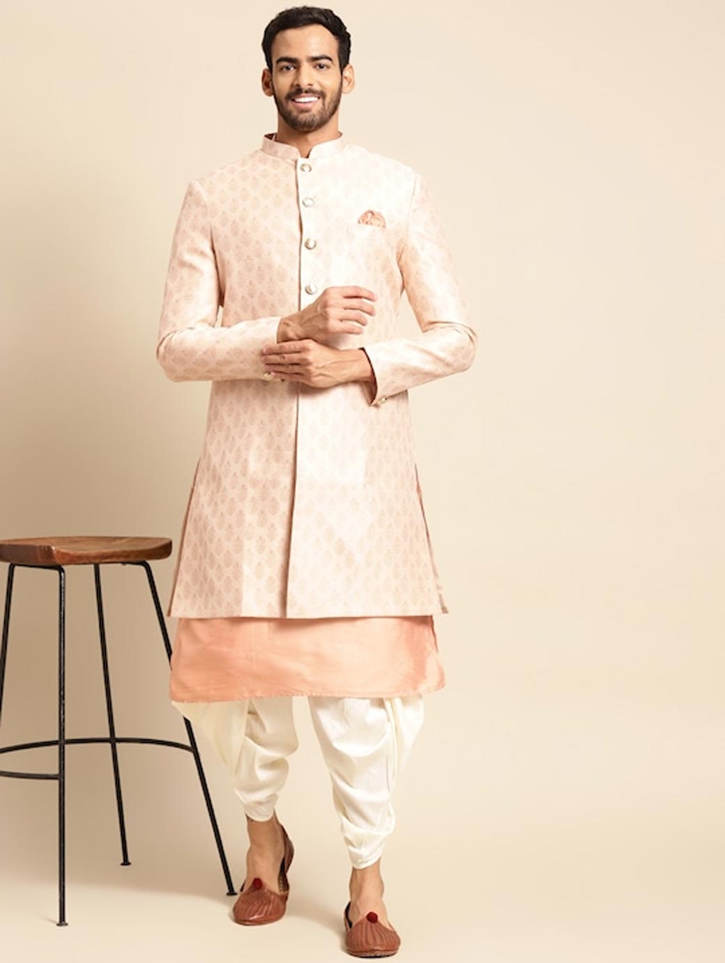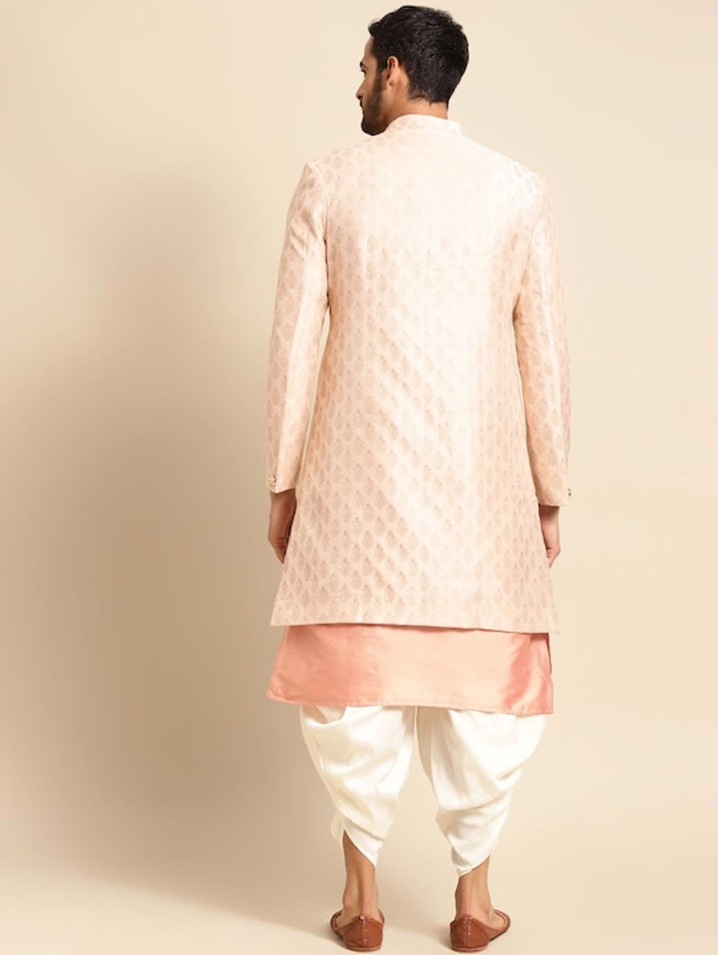 Golden Woven Design Kurta Sherwani Set Golden woven design Sherwani, has a mandarin collar, a button placket, long sleeves, straight hem, multiple slits Coral pink solid kurta, has a mandarin collar, button closures on the front, side slits Golden solid dhoti pants, has drawstring closure.