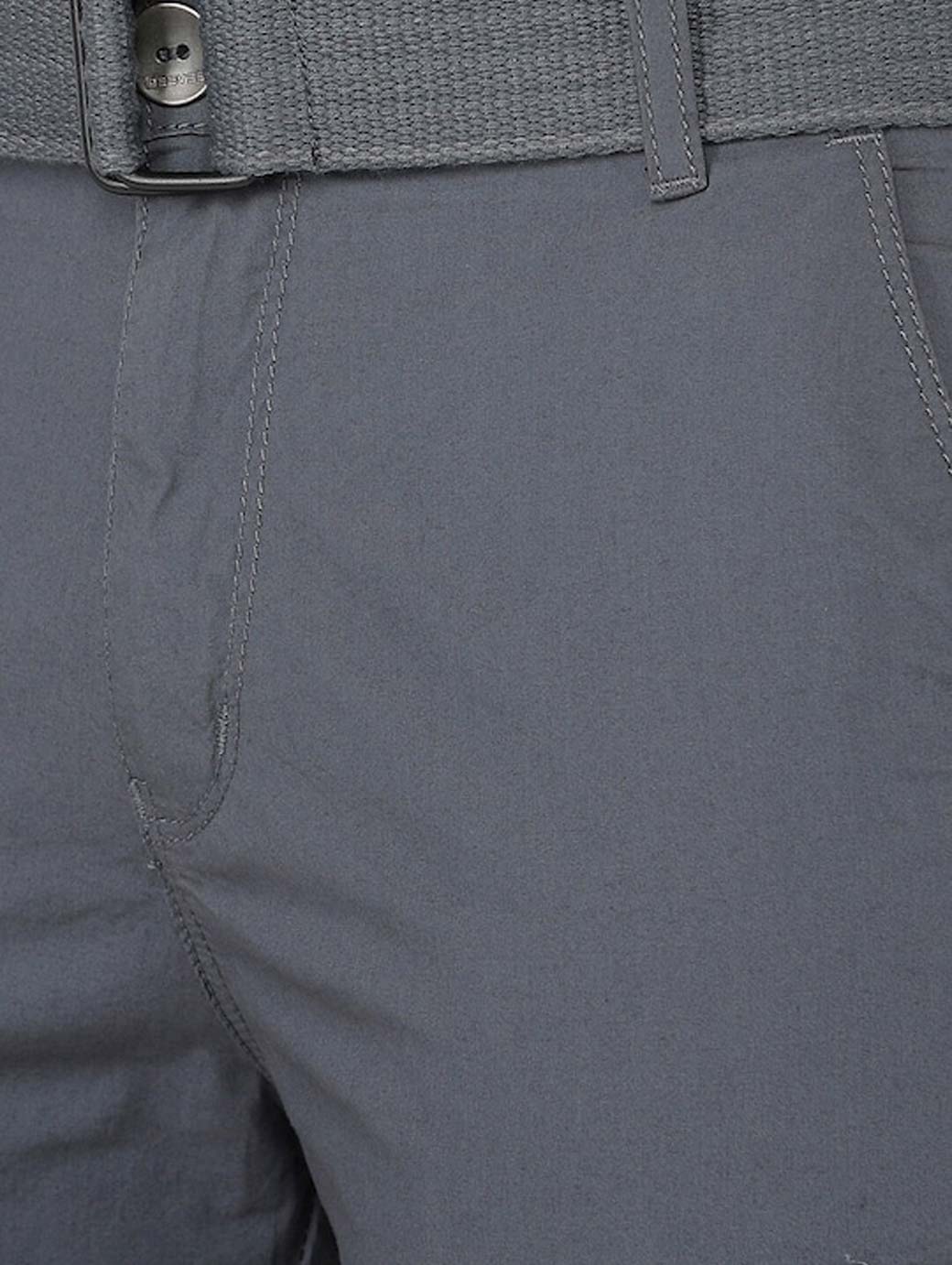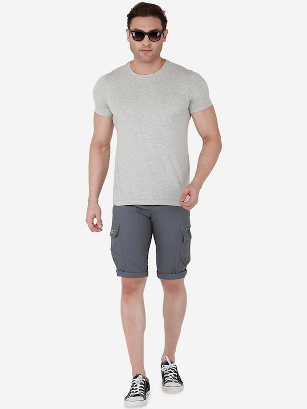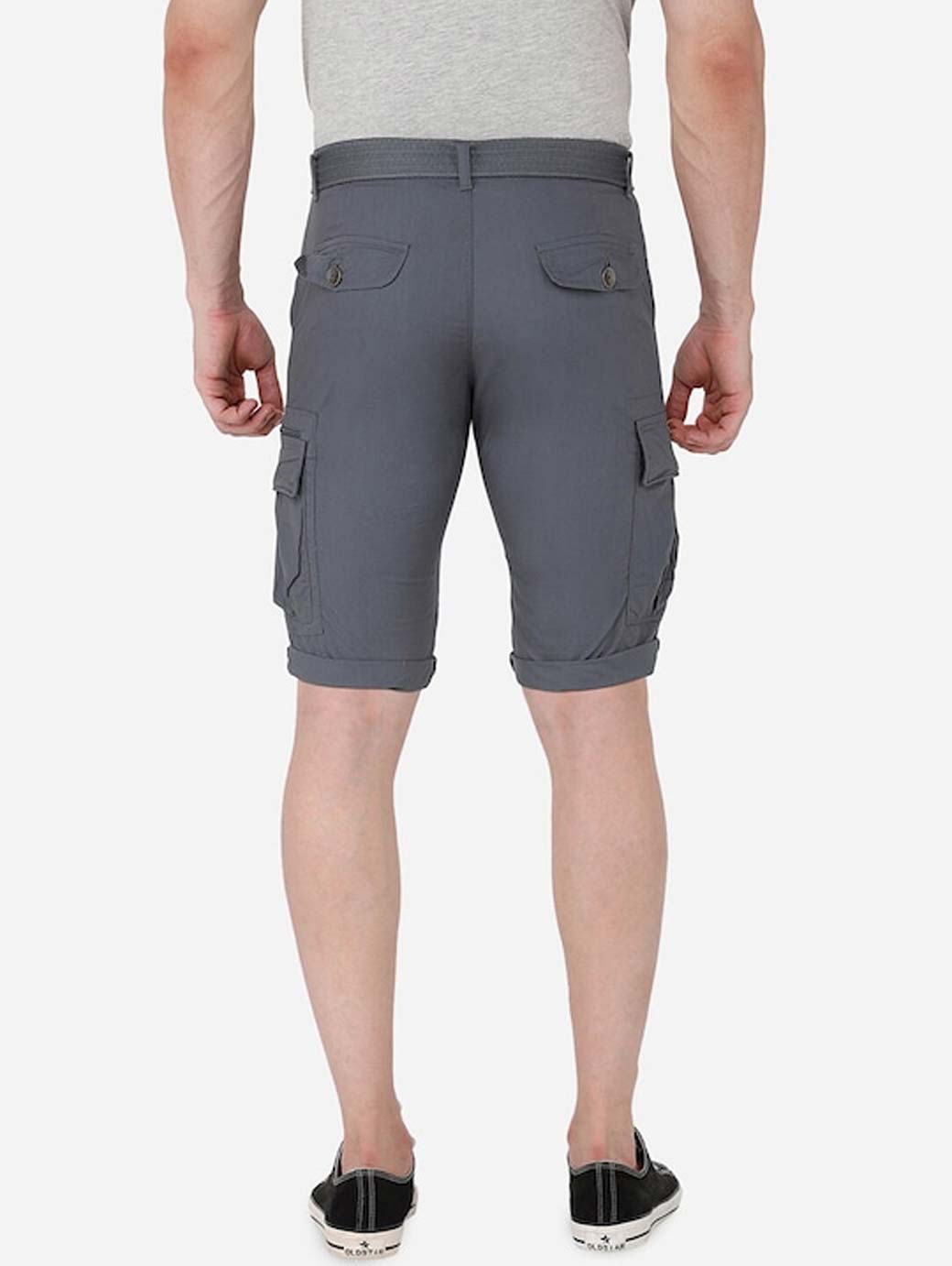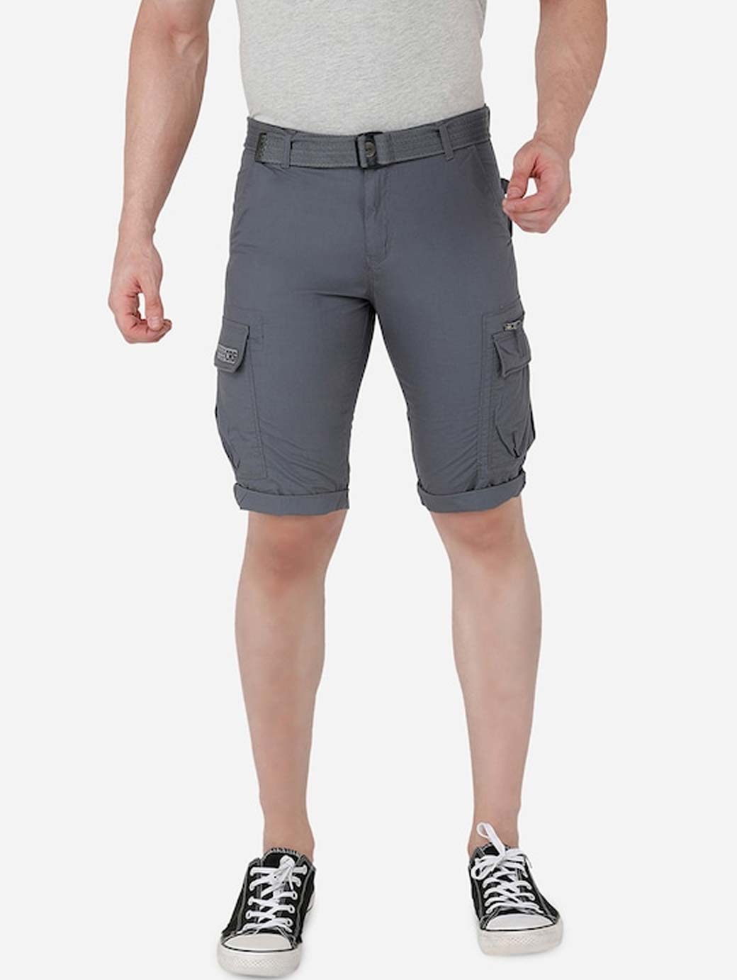 Grey mid-rise cargo shorts, has 6 pockets, button closure with belt