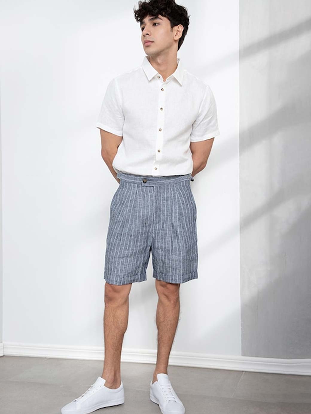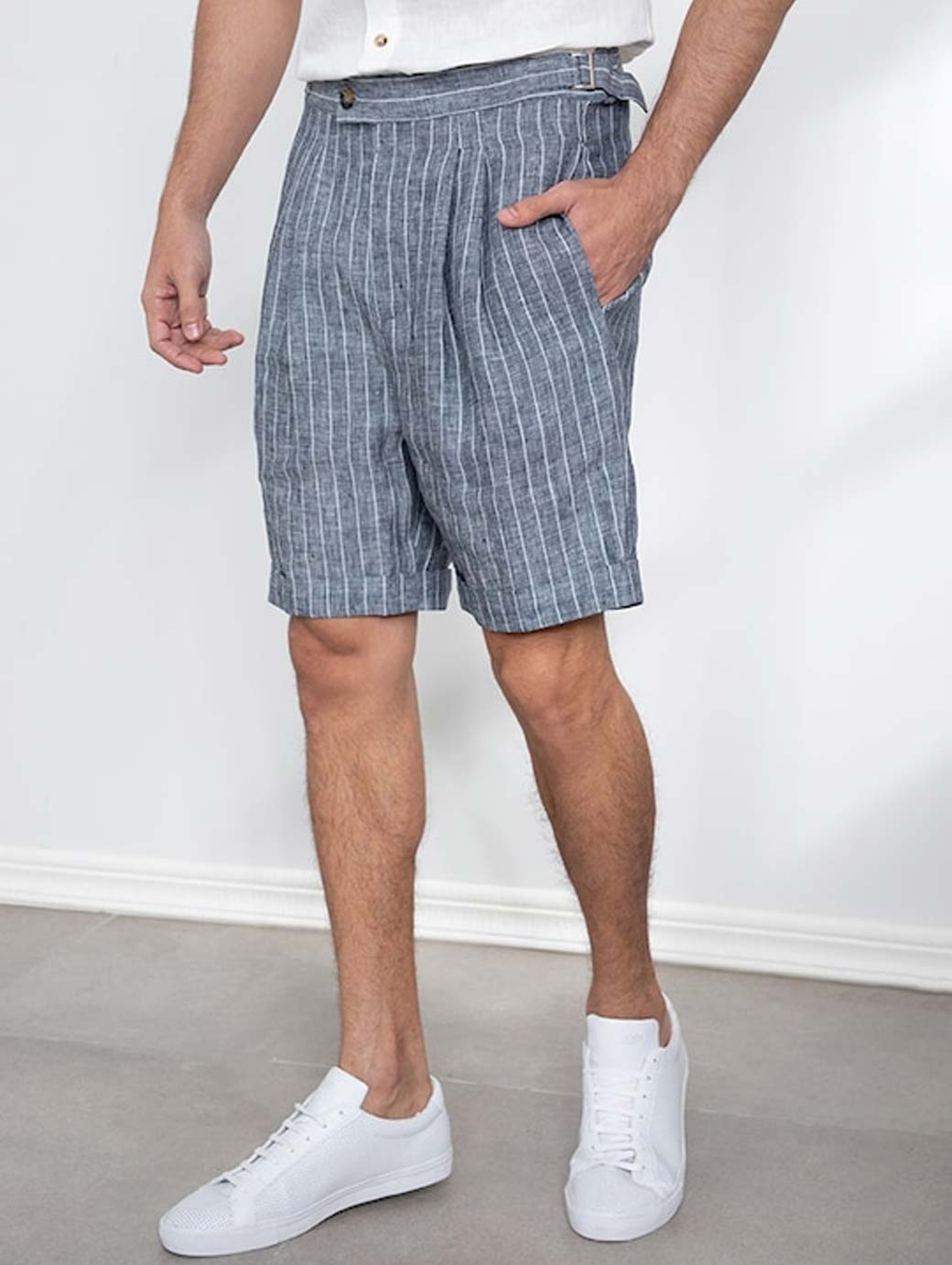 Grey striped mid-rise slim fit shorts has button closure and 4 pockets