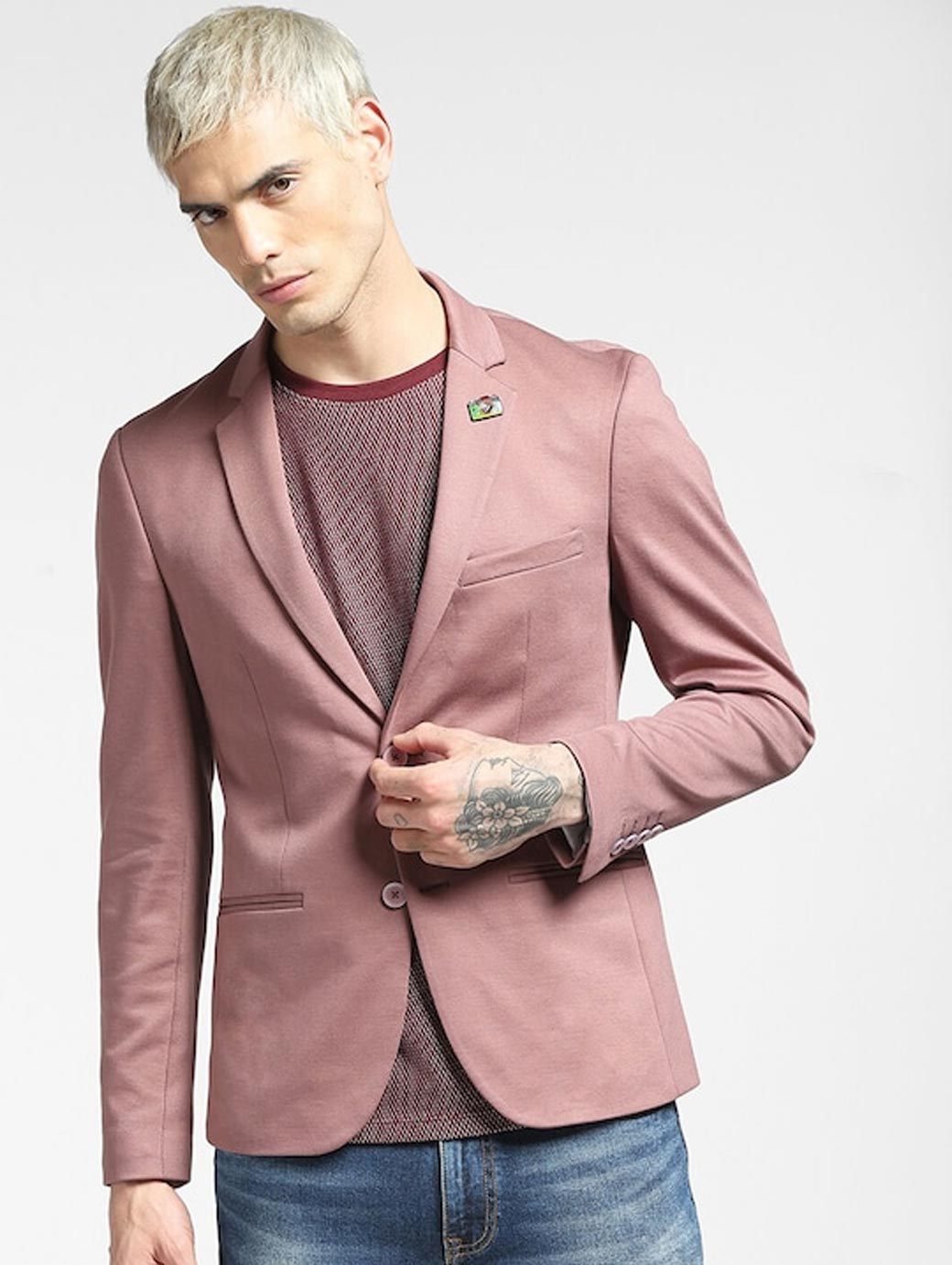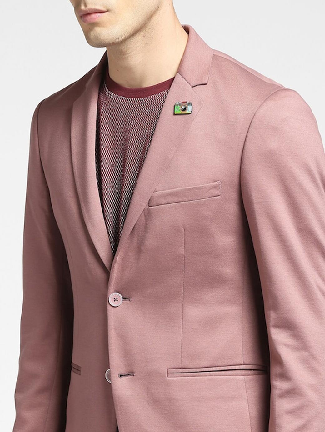 Pink solid regular-fit single-breasted casual blazer, has a notched lapel collar, button closure, long sleeves, two flap pockets, one chest welt pockets, double vented back hem