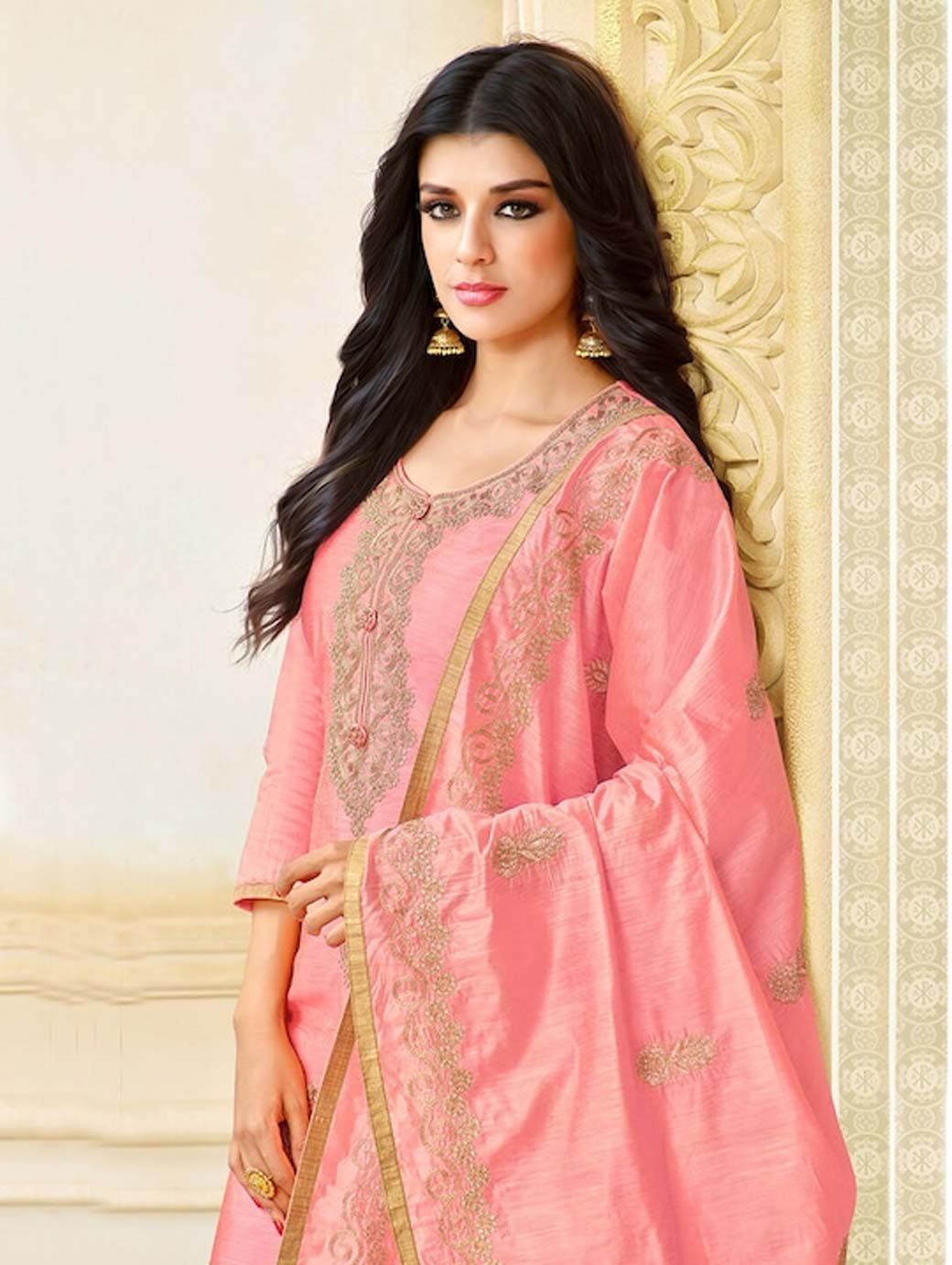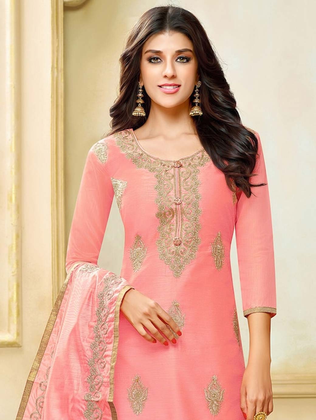 Peach-coloured and gold-toned embroidered kurta fabric