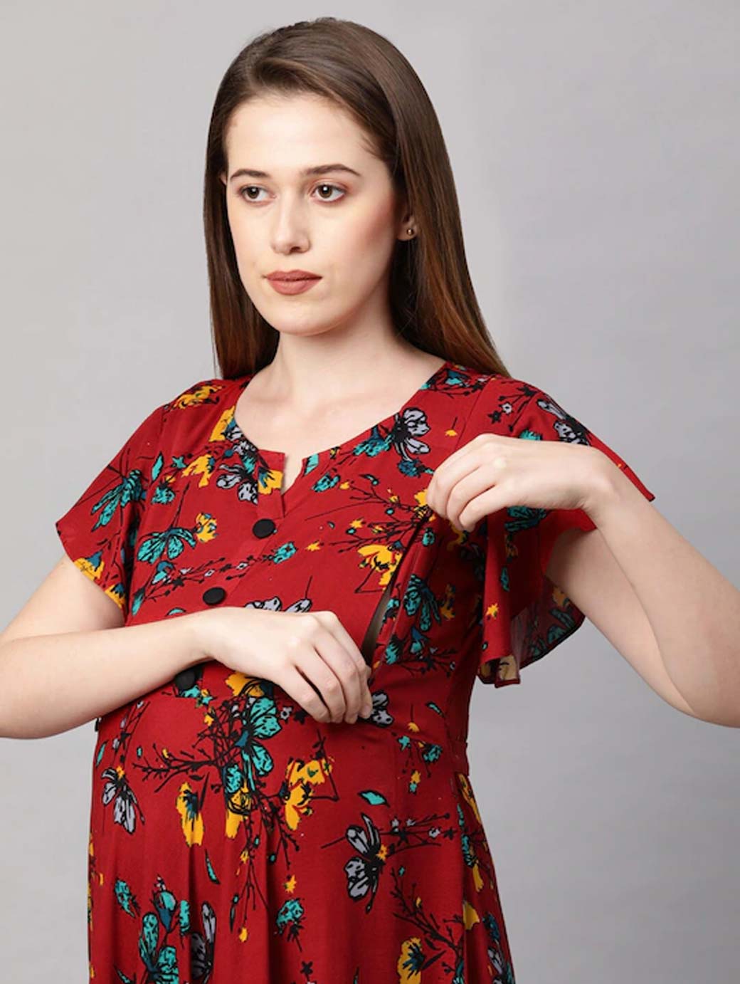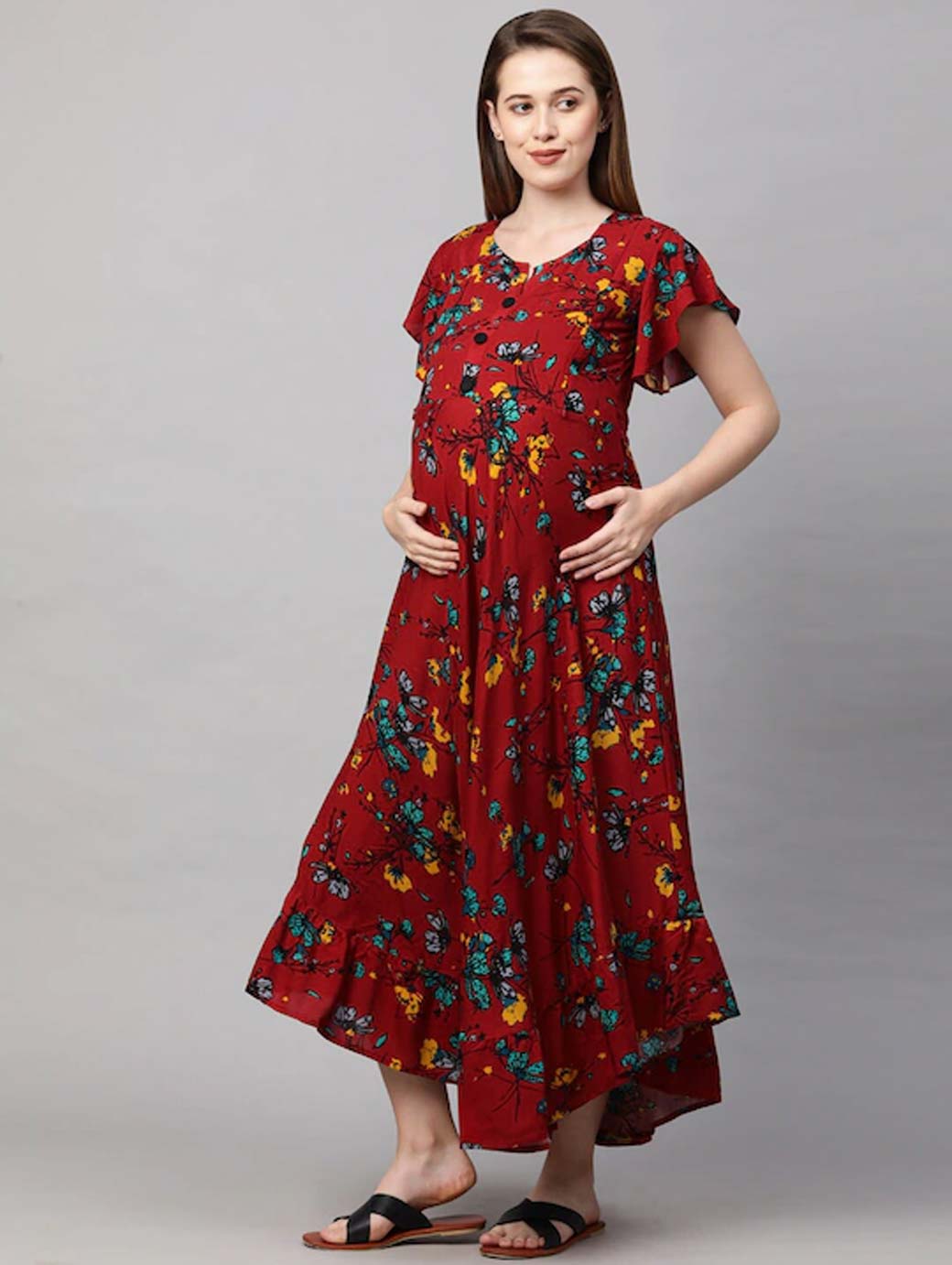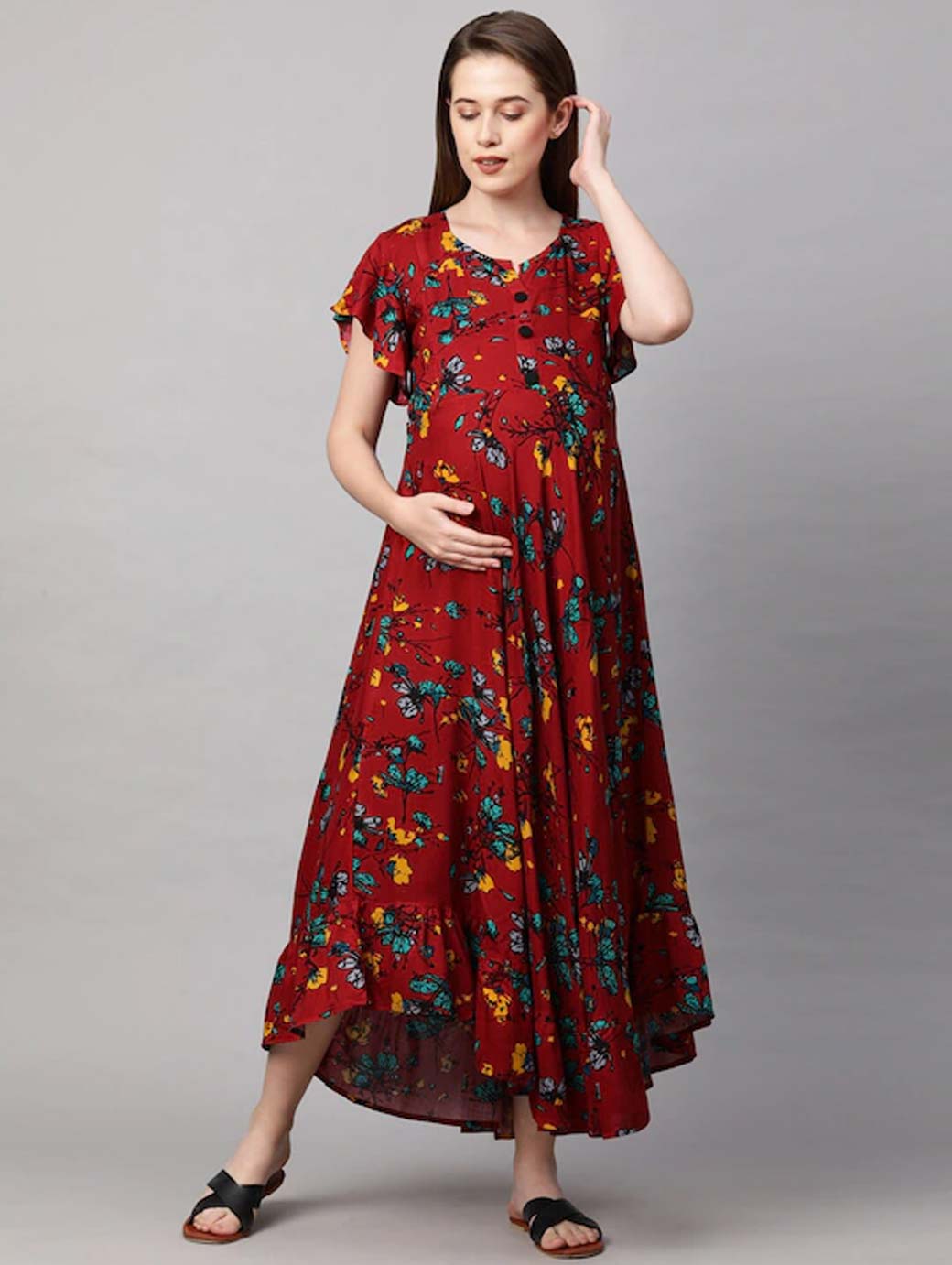 Red floral print maxi dress Round neck Short, flared sleeve Maxi length in flared hem Concealed zip closure