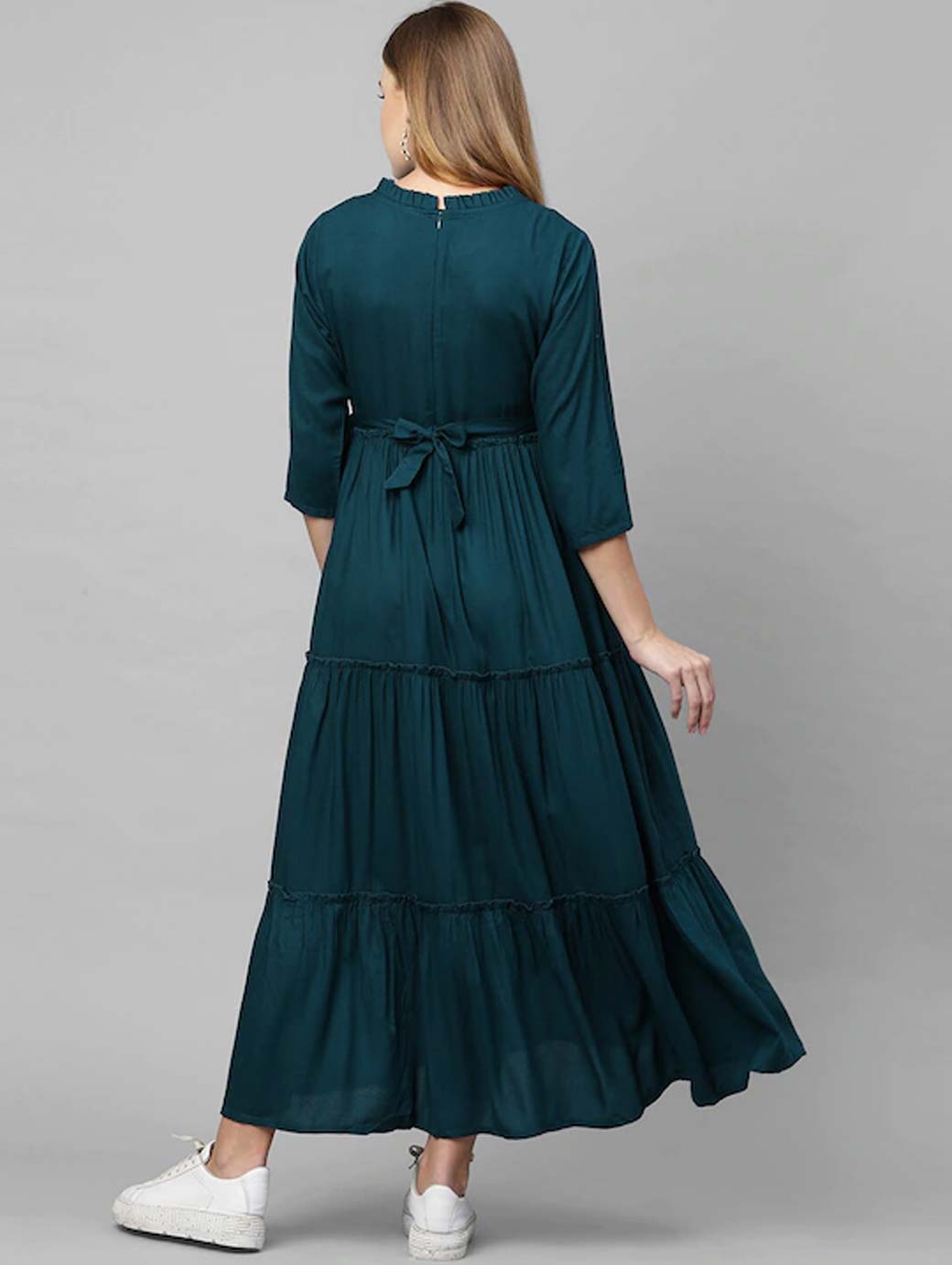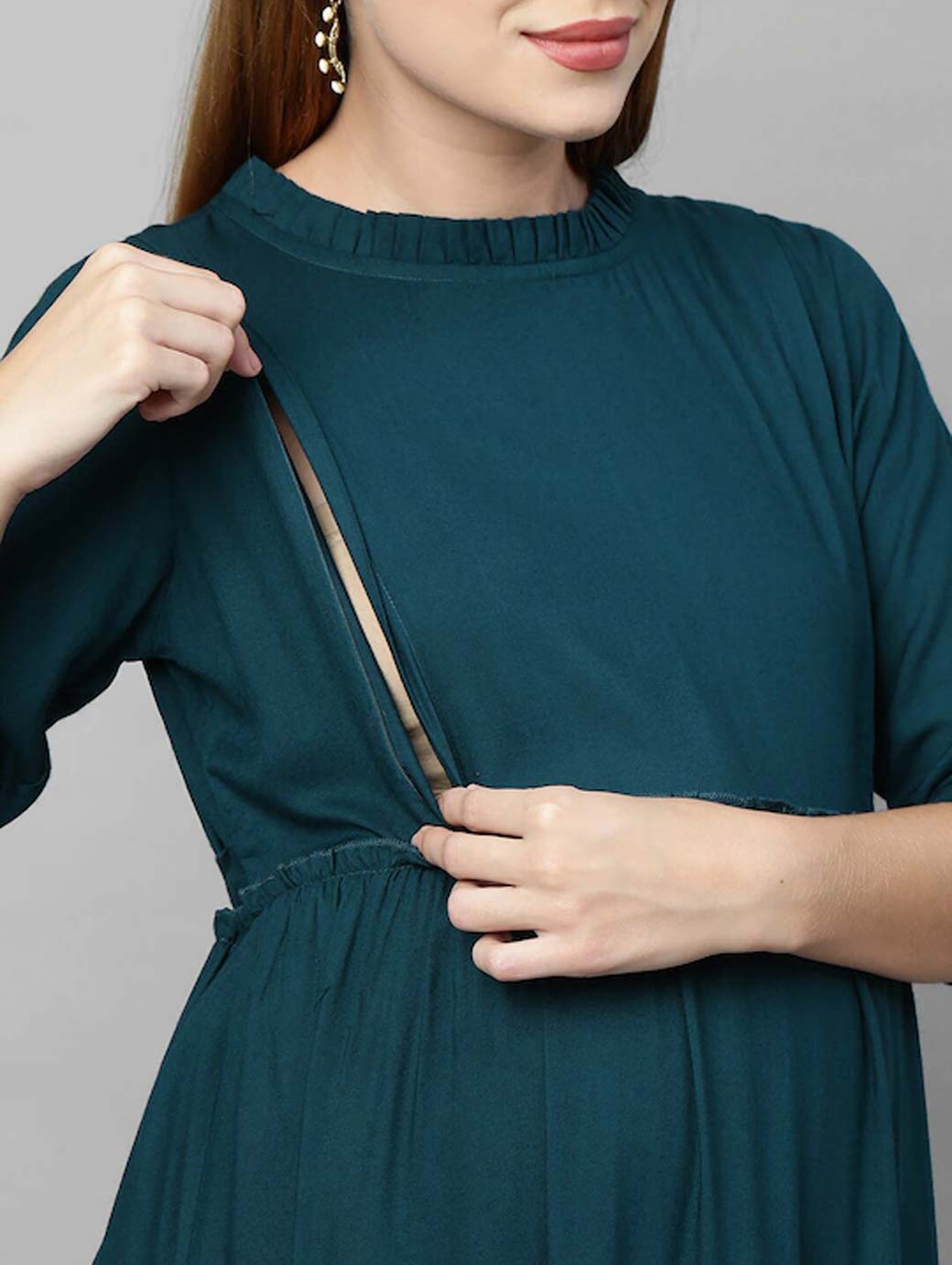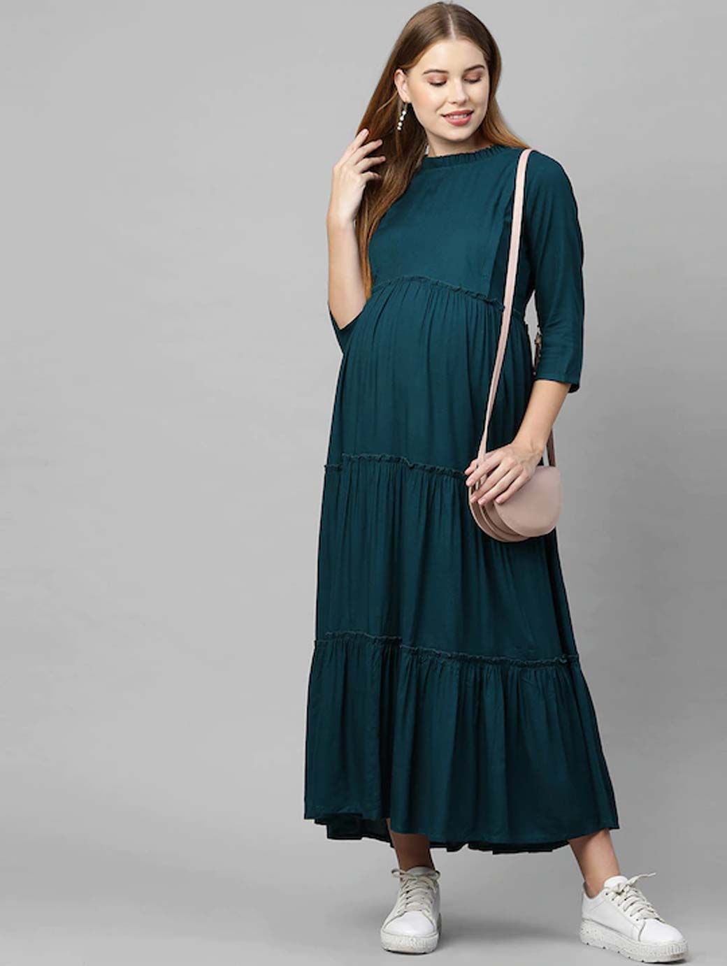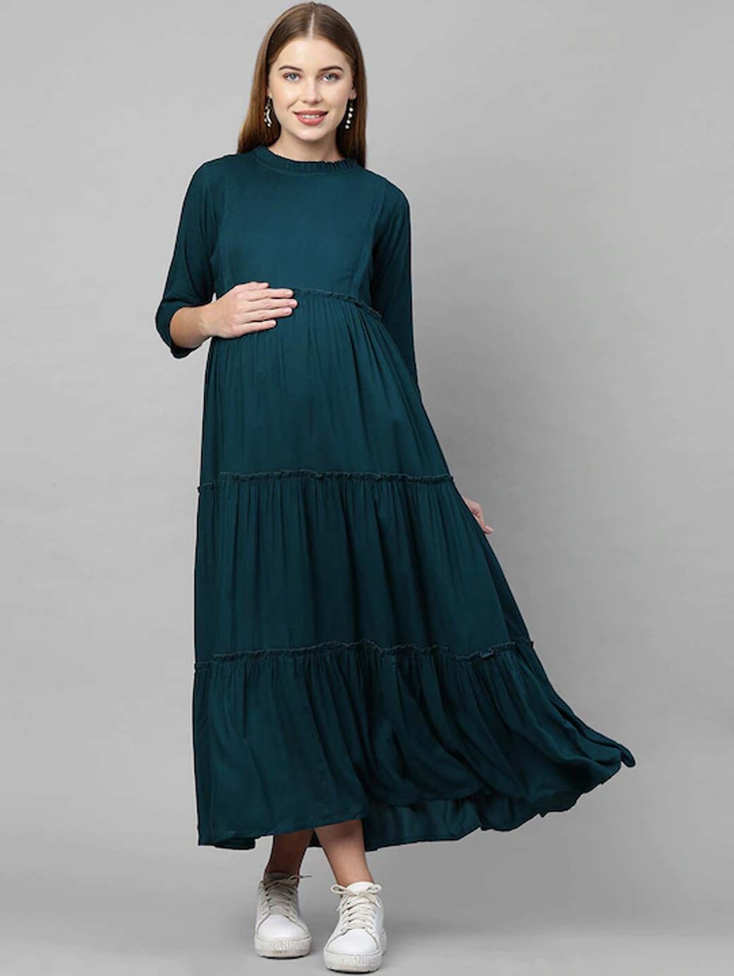 Teal Green maternity maxi dress Round neck Three-quarter, regular sleeves Gathered or pleated detail Maxi length in flared hem
