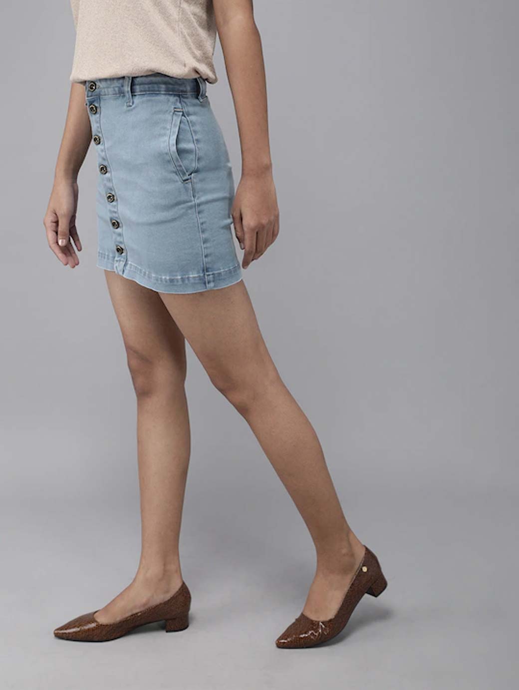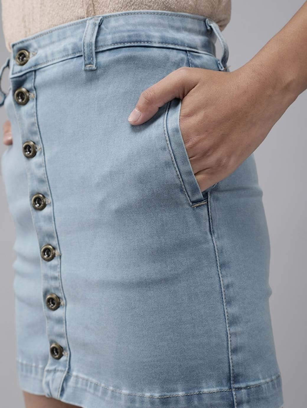 Blue solid woven denim skirt, has a waistband with belt loops, button closure, 2  pockets, straight hem