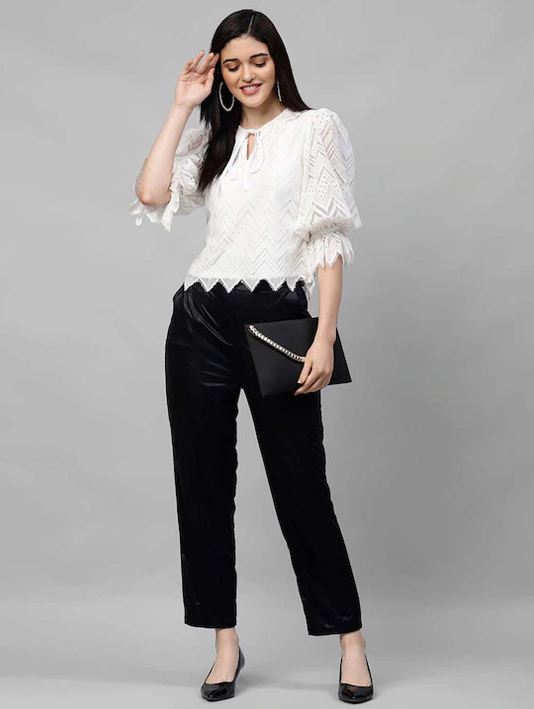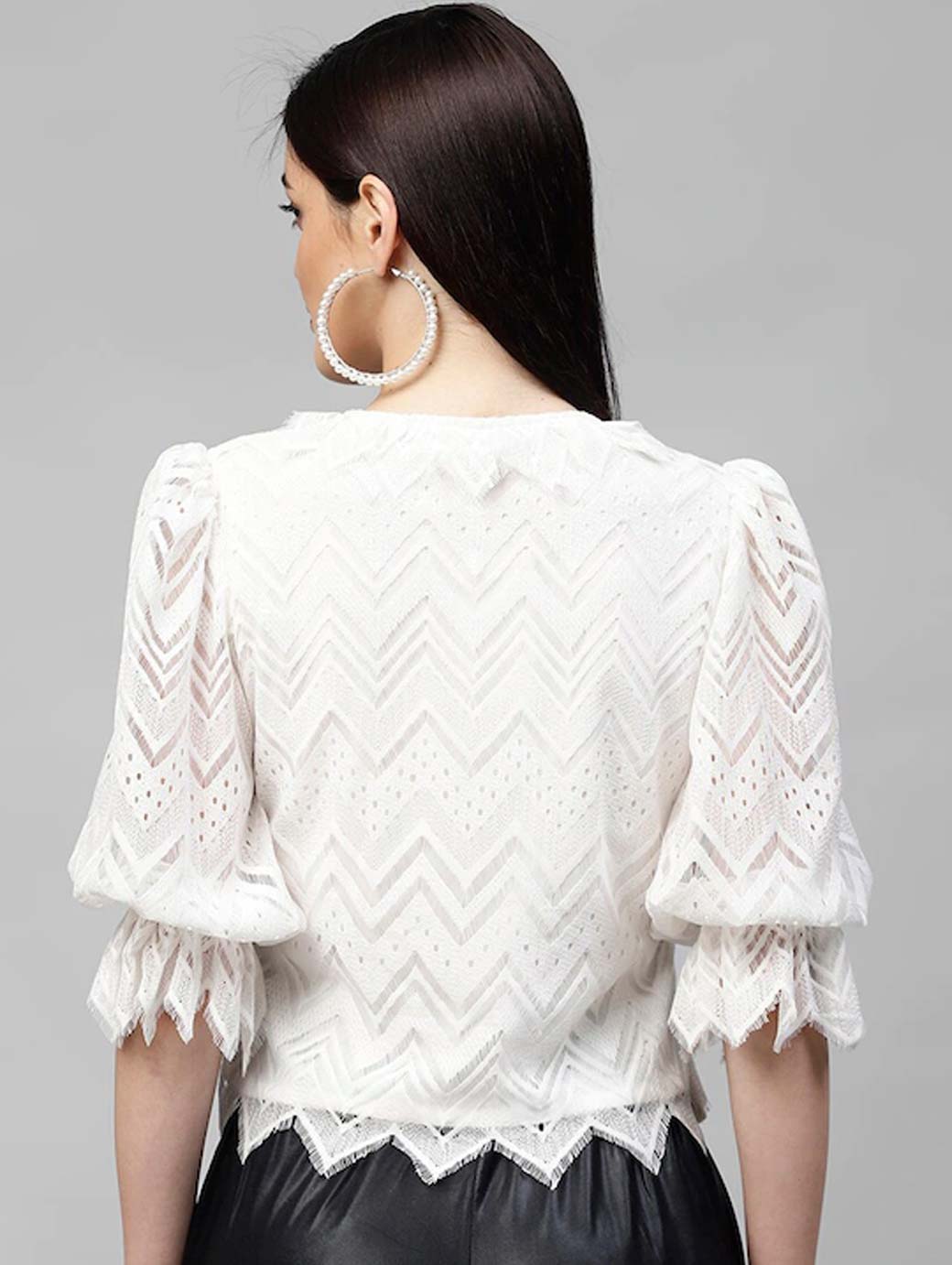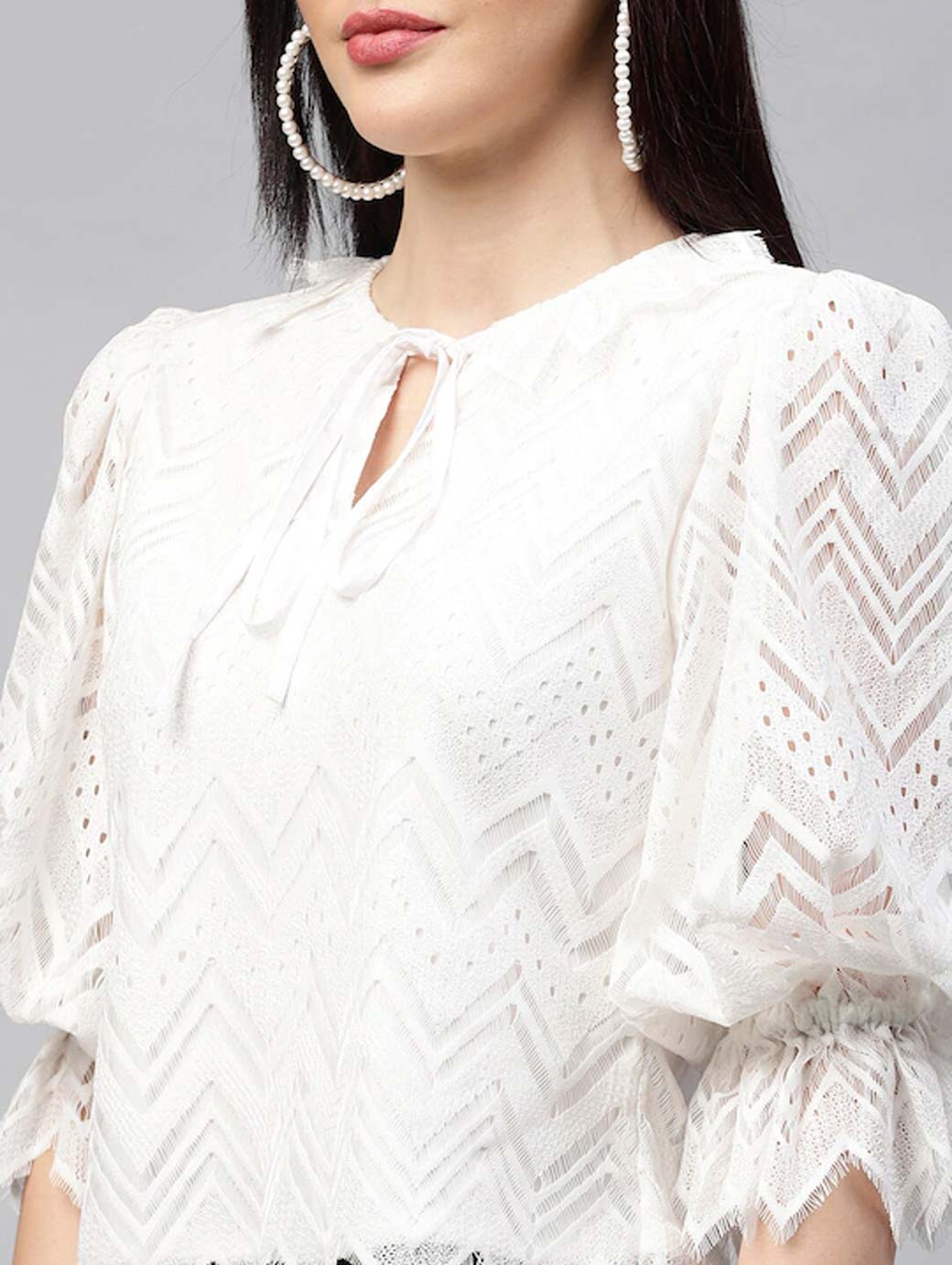 White Tie-Up Neck Puff Sleeves Lace Top