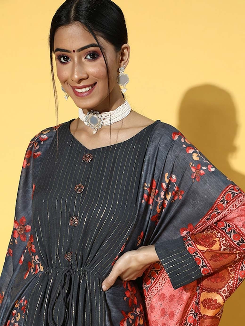 Designed to impress, this modish dress is ideal for any occasion. Crafted with a beautiful ethnic motifs print and round neck, this dress will elevate your appeal. Charcoal shade Beautiful ethnic motifs print Round neck Three-quarter kimono sleeves Cotton, hand wash Trend Alert With gathered volumes, tiers, pleats, bias drapes, and swaying silhouettes, the swirling volumes trend is a mix of whimsical and playful femininity. It plays with beautiful prints and patterns, such as floral, pastel colour-blocking, embroidered, Nu Noheme, floral all-over print, ombre, rich gold foil print, porcelain blooms, and so on.