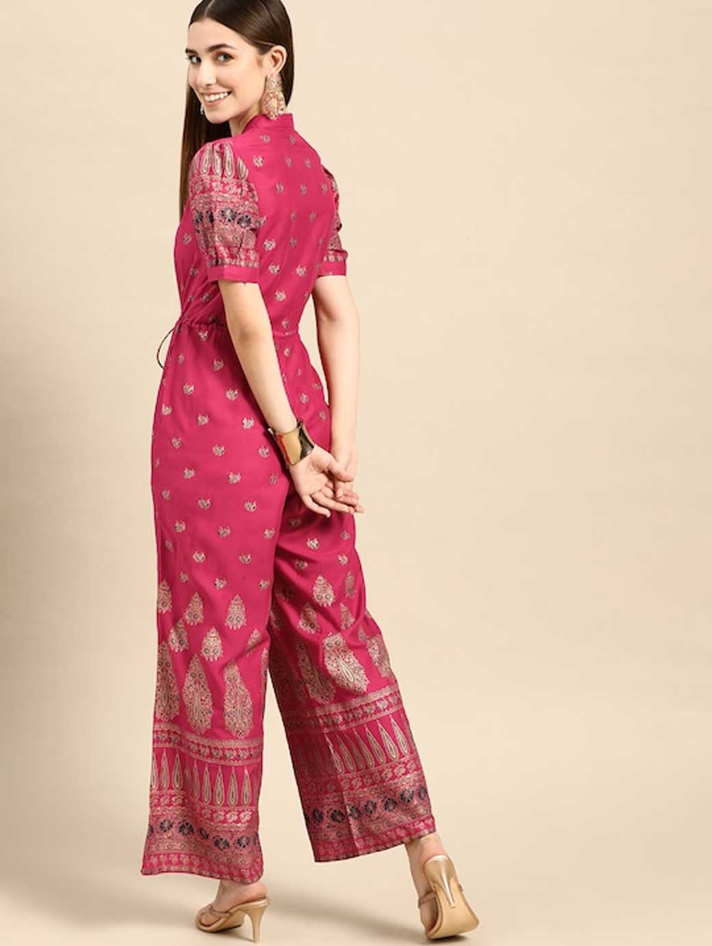 Magenta and golden ethnic motifs printed basic jumpsuit with gathers, tie-up detail, has a notched lapel neck, short, puff sleeves, 2 pockets