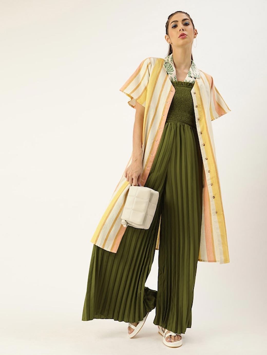 Women Olive Green Solid Accordion Pleated Smocked Basic Jumpsuit