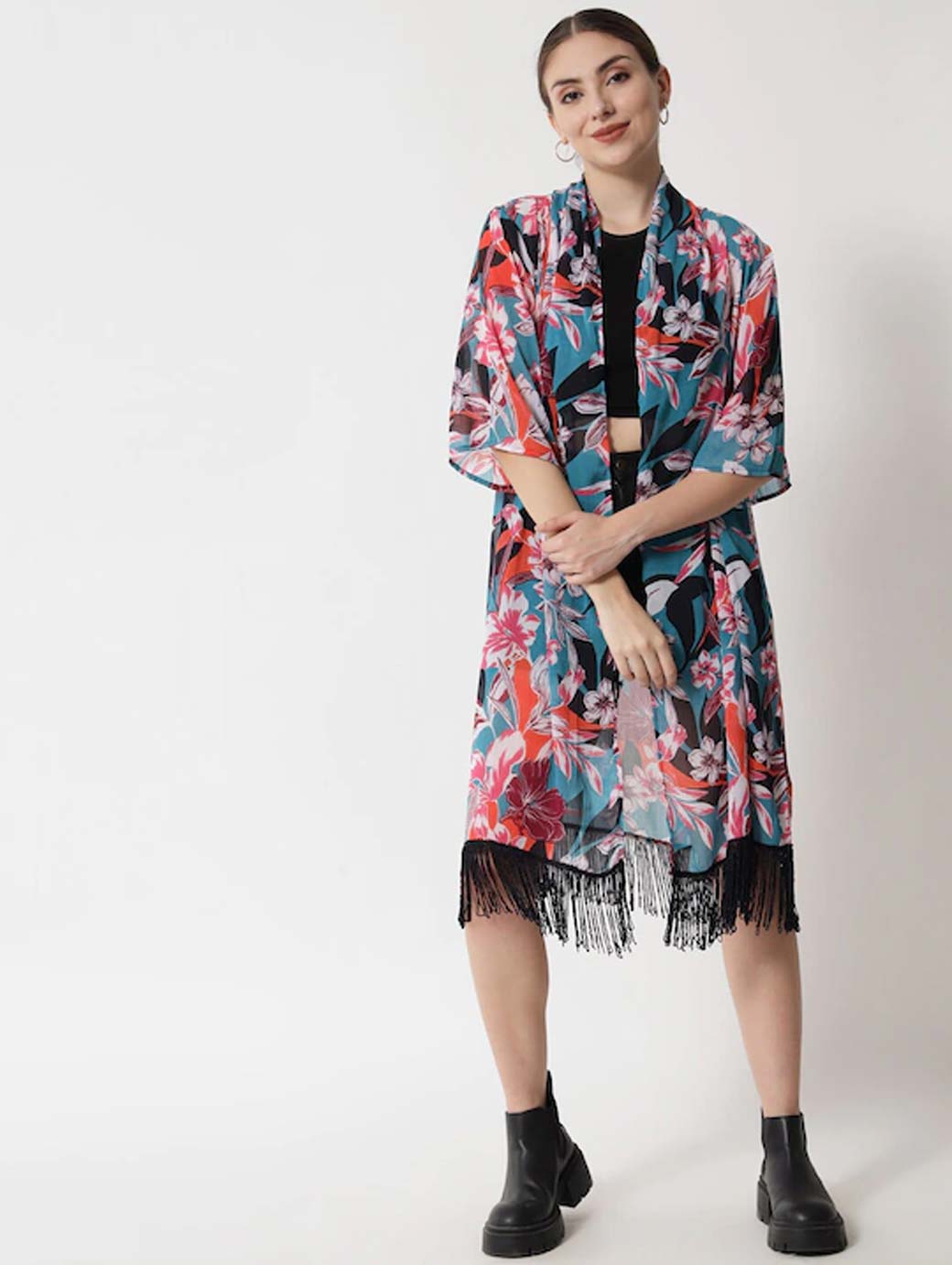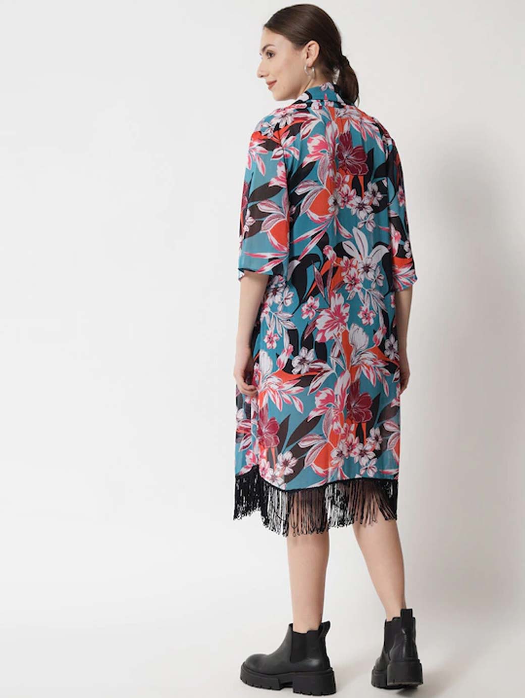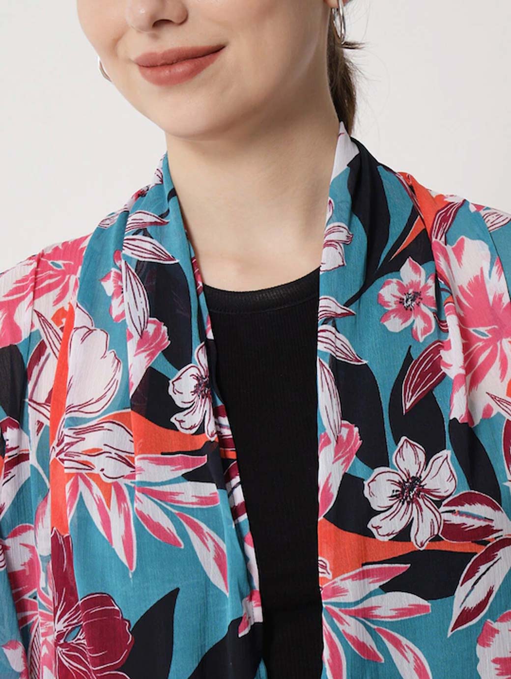 Pink and blue printed open front longline shrug ,has three-quarter sleeves, straight hem