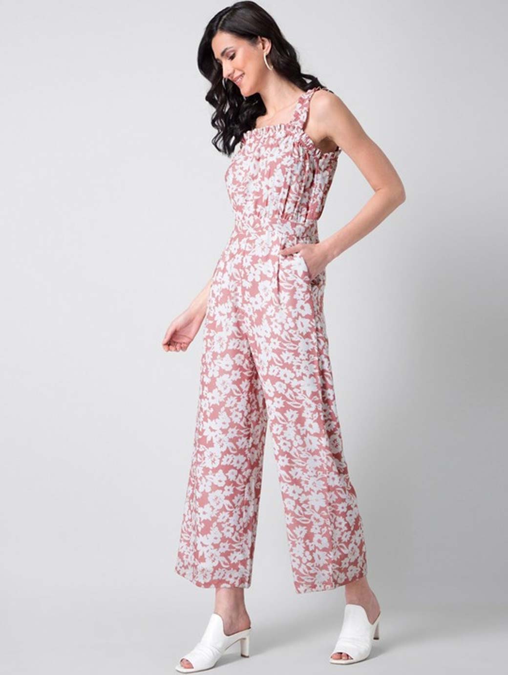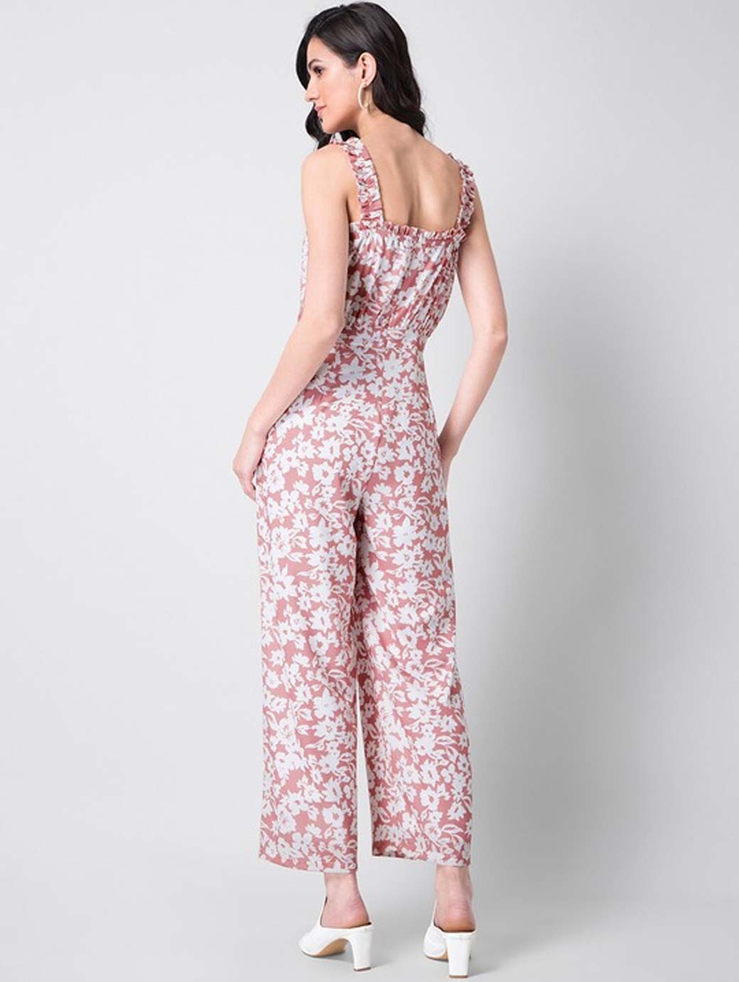 Pink printed basic jumpsuit, has a shoulder straps, sleeveless