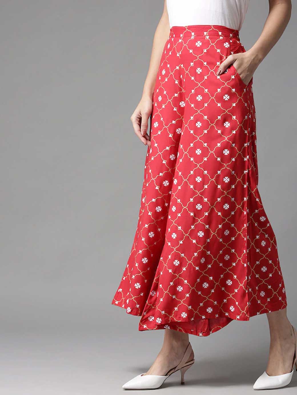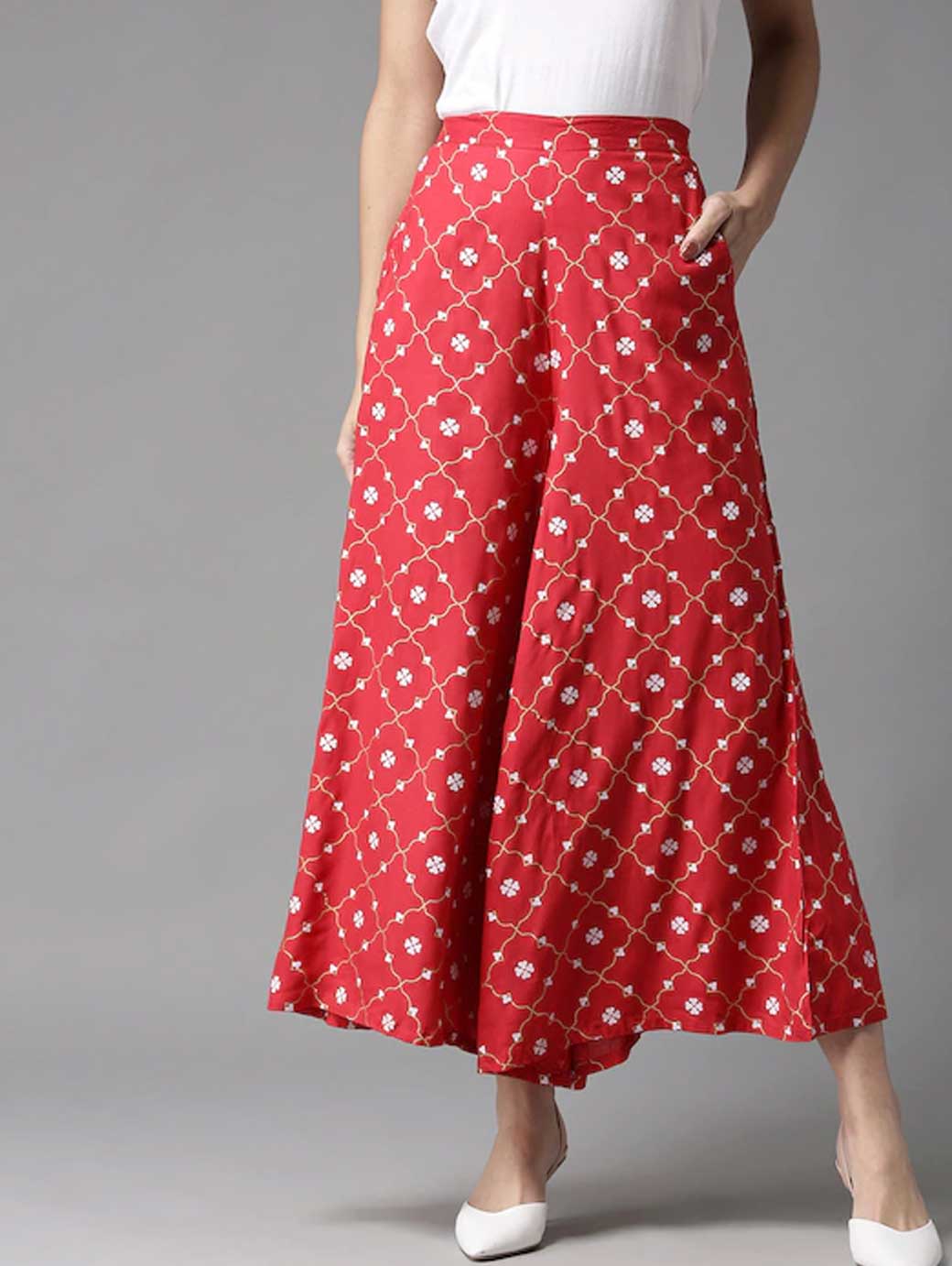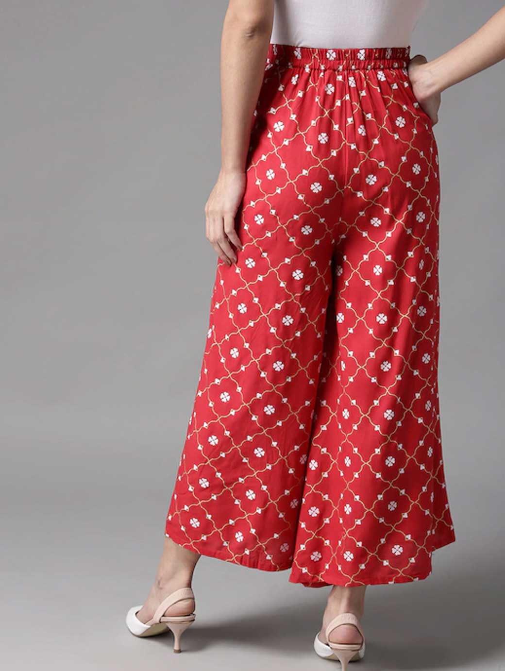 A pair of red and white printed woven wide leg fit palazzos, opaque, two pockets, concealed zip closure