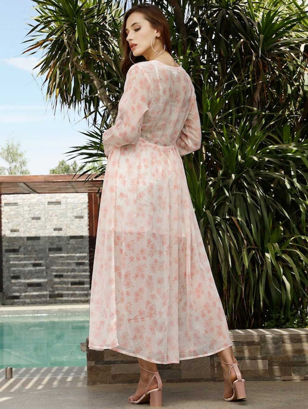 White and pink printed tie-up longline shrug ,has long sleeves, gathers detail, straight hem